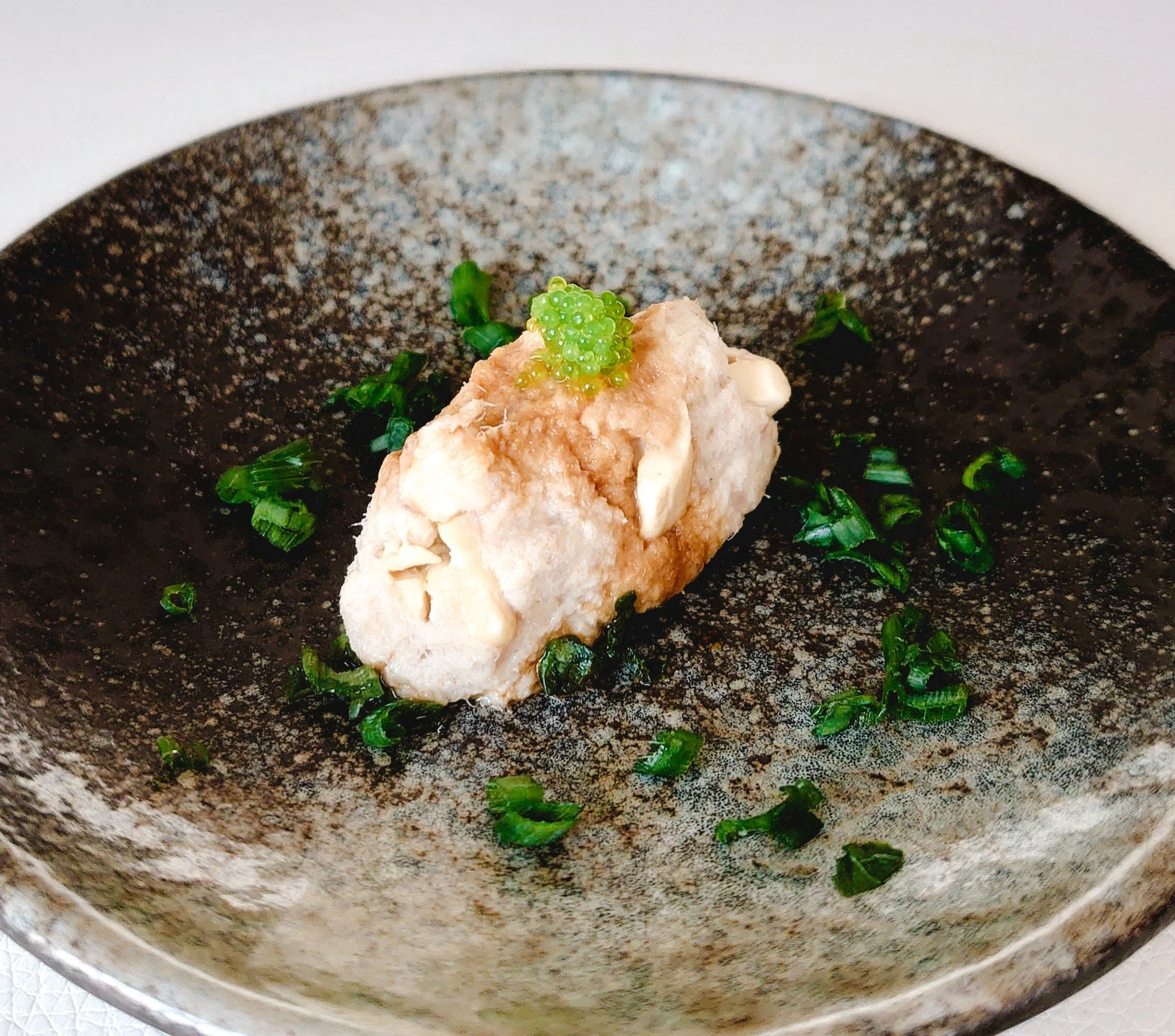 Als topping wordt kaviaar gebruikt die op smaak is gebracht met wasabi en groente en daarna wordt bestrooid met dungesneden ui.